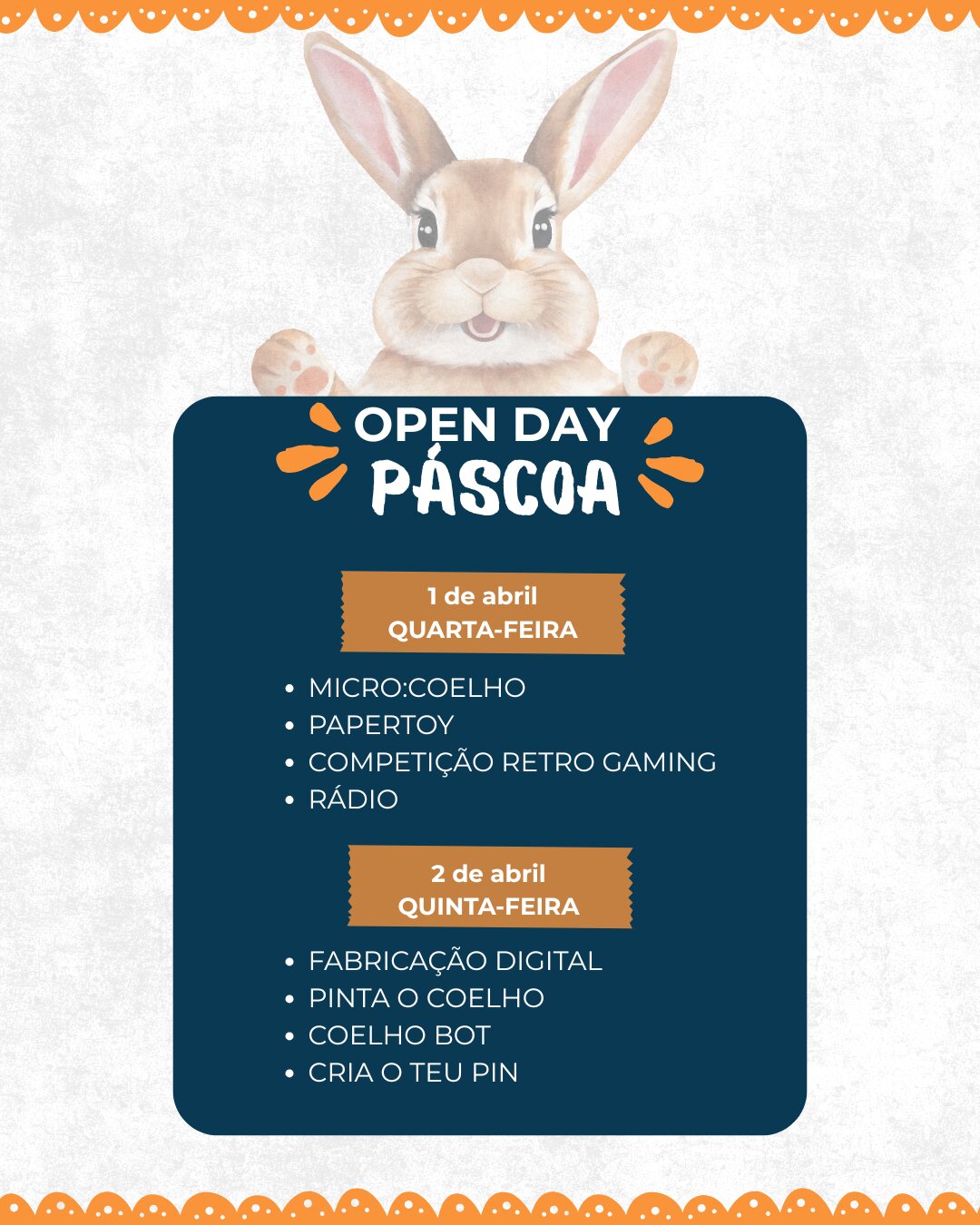 A Páscoa no Centro de Inovação Carlos Fiolhais (CICF) celebra-se nos dias 1 e 2 de abril, com atividades práticas e inovadoras que combinam arte, gaming, robótica e fabricação digital. Com uma metodologia hands-on, oferecemos experiências diversificadas que respeitam diferentes interesses e estilos de aprendizagem. Se tens entre 12 e 18 anos não percas esta oportunidade!